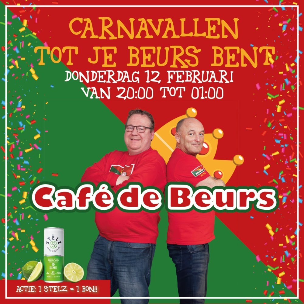 Carnavalfeest! Feesten tot je Beurs Bent! Thursday, 12 February 20:00 Café de Beurs Spring en zing mee, knotsgekke prijzen, carnavalskrakers, Bewegingsbingo en Sing a long met niemand minder Rens Merkelbach en DJ Peerke!! Read more Spring en zing mee, knotsgekke prijzen, carnavalskrakers, Bewegingsbingo en Sing a long met niemand minder Rens Merkelbach en DJ Peerke!! Klappeijstraat 4, 4901HE Oosterhout