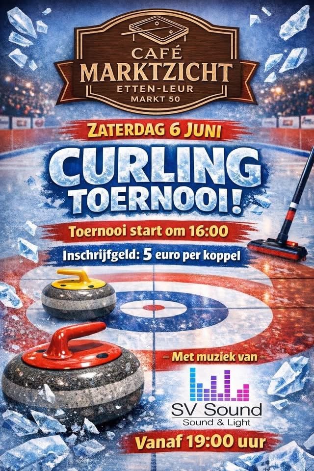 Café Marktzicht op de Markt in Etten-Leur houdt op zaterdag 6 juni een Curling Toernooi. Het start om 16.00 uur en vanaf 19.00 uur wordt de muziek verzorgd door SV Sound & Light. Het inschrijfgeld is slechts 5 euro per koppel.