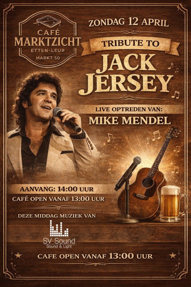 Jack Jersey tribute bij Marktzicht Sunday, 12 April 14:00 Café-zaal Marktzicht Etten-Leur Mike Mendel zingt 2 x 30 minuten Jack Jersey Read more Jack Jersey tributeZondag 12-04-2026 | 14:00 - 19:00Entree: GratisMuzikale middag met muziek van SV Sound en Mike Mendel zingt 2 x 30 minuten Jack Jersey Markt 50, 4875 CG Etten-Leur