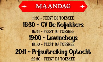 Kiel Eiland Monday, 16 February 11:30 Spinola Kom naar Kiel Eiland en vier carnaval op een unieke plek waar muziek, gezelligheid en feest samenkomen! Read more 11:30 - Feest DJ Toeskee16:30 - CV De Koljakkers16:55 - Feest DJ Toeskee19:00 - Lawineboys19:30 - Feest DJ Toeskee20:11 - Prijsuitreiking Optocht22:30 - Feest DJ Toeskee Haven 26, 4811 WL Breda