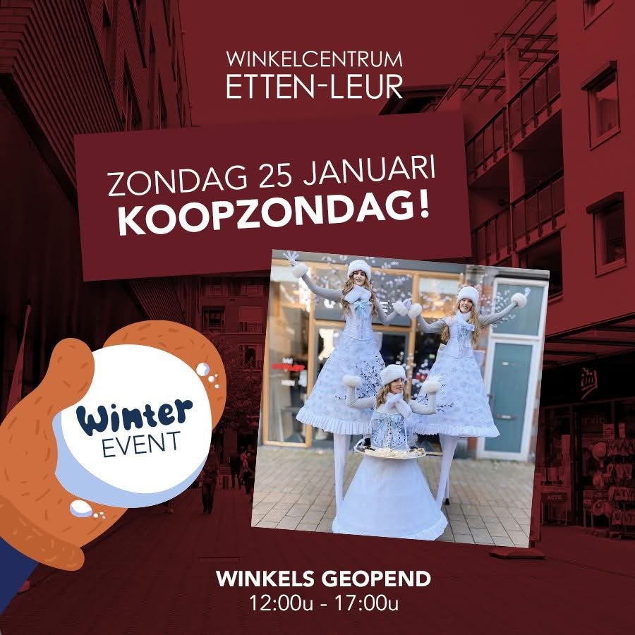 Elke laatste zondag van de maand is het Koopzondag in Winkelcentrum Etten-Leur. Tussen 12:00 en 17:00 uur kun je volop shoppen. Profiteer extra van de SALE!