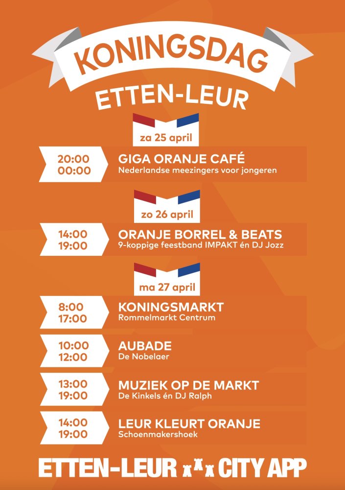 Ook dit jaar valt er op en rond Koningsdag in Etten-Leur weer veel te beleven. Etten-Leur City App zet hier de boel voor je op een rijtje. Een eerste overzicht...