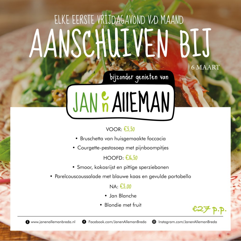 Je kunt bij ons elke eerste vrijdagavond van de maand aanschuiven vanaf 17:00 (de keuken sluit om 20:00). Het hele menu kost €29,- maar het is ook mogelijk de gangen los te bestellen. Reserveren kan via de telefoon 076- 7634055 of mail naar info@janenallemanbreda.nl