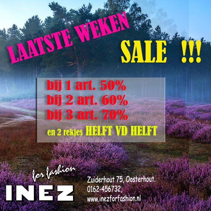 INEZ FOR FASHION SALE 20 February - 28 February Inez for Fashion Laatste weken SALE!! Bij 1 art. 50% Bij 2 art. 60% Bij 3 art. 70% En 2 rekjes helft VD helft Read more Laatste weken SALE!!Bij 1 art. 50%Bij 2 art. 60%Bij 3 art. 70%En 2 rekjes helft VD helft Zuiderhout 75, 4904 AV Oosterhout