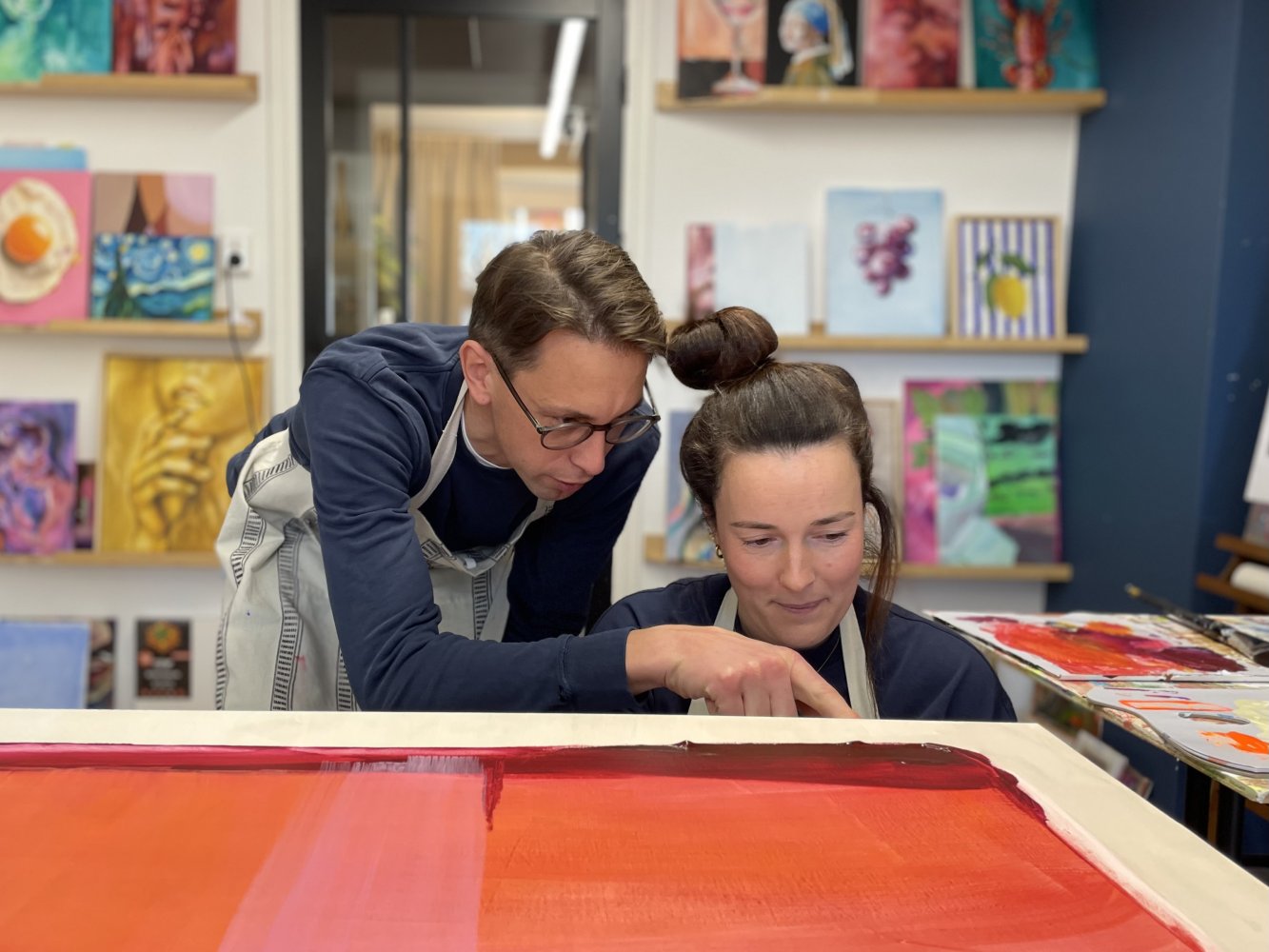 Vervolgens ga je zelf aan de slag, met professionele begeleiding bij elke stap. Je maakt het kunstwerk helemaal zelf, maar staat er nooit alleen voor. Daphne begeleidt het proces, denkt mee in kleur, compositie en techniek en helpt je om jouw idee ook echt goed uit te voeren. Alle materialen en benodigdheden zijn aanwezig en je kunt werken op grotere doeken. Of je nu abstract of figuratief wilt schilderen, alles wordt afgestemd op wat jij wilt maken.