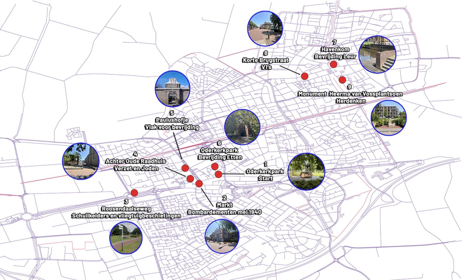 De route voert je langs verschillende locaties in de gemeente waar zich tijdens de oorlog ingrijpende en spraakmakende gebeurtenissen hebben afgespeeld. De start ligt in het Oderkerkpark en eindigt bij het Heerma van Vossplantsoen.