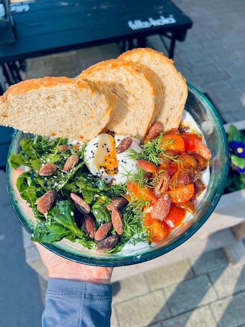 Turkish Eggs: een romige yoghurt bowl met een zachtgekookt eitje en tomaten in harissaboter. Comfort food met een kruidige kick.