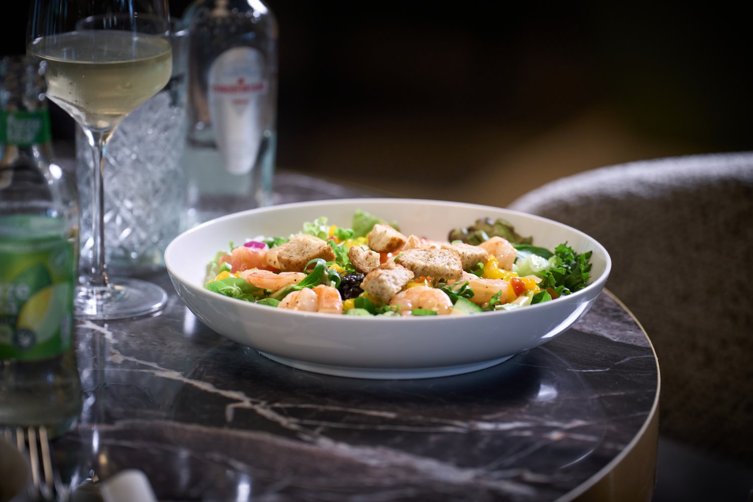 gamba | sinaasappel-chili dressing | tomaat | komkommer | rode ui |mango salsa | croutons